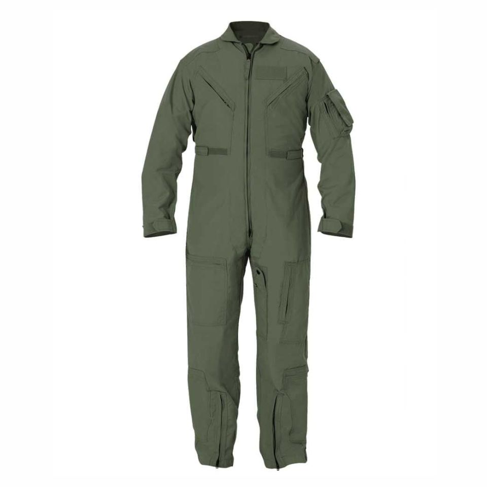 El traje de vuelo fabricado con tela de aramida Nomex® resistente a las llamas y que no se derrite cumple con NIR y está construido según las especificaciones militares que usan todas las tripulaciones de vuelo de EE. UU.